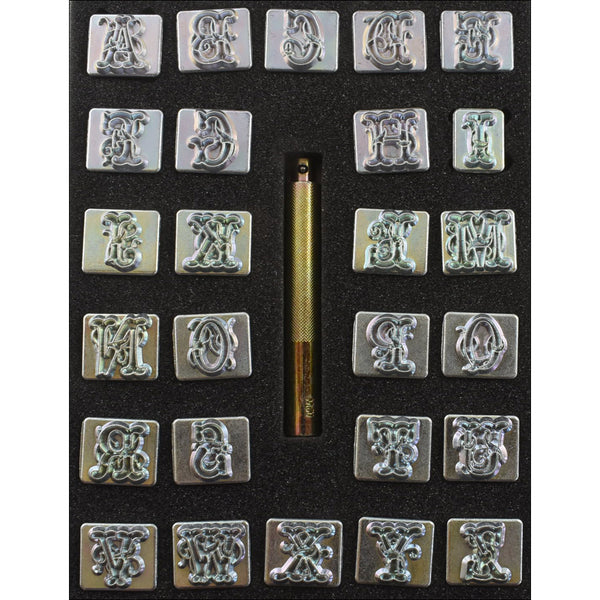 This alphabet set is perfect for personalizing your leathercraft projects. Great for everyday stamping of names and initials on all your handcrafted projects. These decorative script-style motif alphabet characters feature clean, crisp edges. Includes 26 cast zinc/zinc plated letters (A-Z) and a heavy duty steel, zinc plated snap-in handle. Protect your stamps from damage by using a wood, rawhide or poly headed mallet or maul. A metal hammer may damage the handle. For best results, a hard, solid tooling base like a piece of marble or granite is recommended. Stamp impression height is 3/4" (19mm). Snap-in handle is 3-3/4" (7.6cm) long.