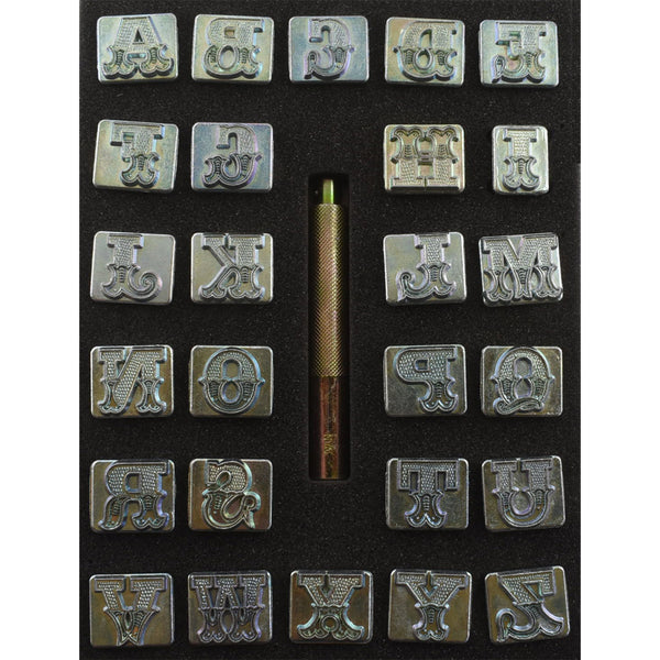 This alphabet set is perfect for personalizing your leathercraft projects. Great for everyday stamping of names and initials on all your handcrafted projects. These decorative leather-art motif alphabet characters feature clean, crisp edges. Includes 26 cast zinc/zinc plated letters (A-Z) and a heavy duty steel, zinc plated snap-in handle. Protect your stamps from damage by using a wood, rawhide or poly headed mallet or maul. A metal hammer may damage the handle. For best results, a hard, solid tooling base like a piece of marble or granite is recommended. Stamp impression height is 3/4" (19mm). Snap-in handle is 3-3/4" (7.6cm) long.