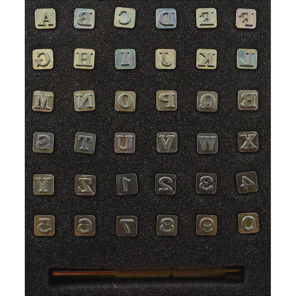 Includes alphabet stamps and number stamps. This classic alphabet font features a clean, crisp design and is perfect for creating personalized small handcrafted leathercraft projects. The set includes 37 pieces - a stamp handle, letters A to Z and numbers 0-9. Use a wood, rawhide or poly headed mallet or maul. Protect your stamps from damage by using a wood, rawhide or poly headed mallet or maul. A metal hammer may damage the handle. For best results, a hard, solid tooling base like a piece of marble or granite is recommended. Stamp impression height is 1/4" (6.5mm). Snap-in handle is 3-3/4" (7.6cm) long.
