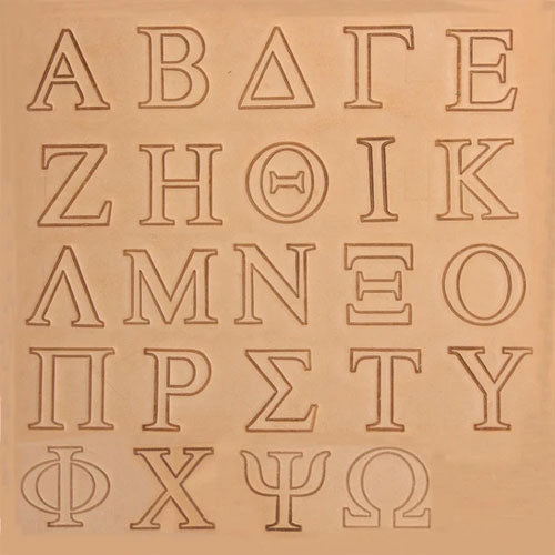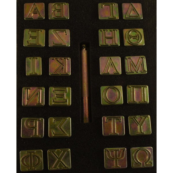 This alphabet set is perfect for personalizing your leathercraft projects. Great for everyday stamping of names and initials on all your handcrafted projects. These Greek alphabet characters feature clean, crisp edges. Includes 24 cast zinc/zinc plated letters and a heavy duty steel, zinc plated snap-in handle. Protect your stamps from damage by using a wood, rawhide or poly headed mallet or maul. A metal hammer may damage the handle. For best results, a hard, solid tooling base like a piece of marble or granite is recommended. Stamp impression height is 3/4" (19mm). Snap-in handle is 3-3/4" (7.6cm) long.