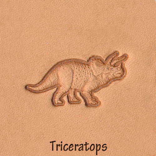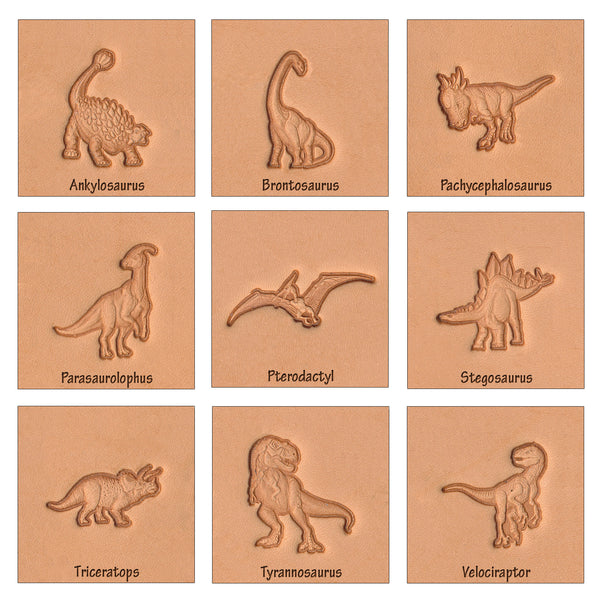 The Dinosaur 3-D Leather Stamp Set contains nine realistic looking dinosaur stamps and a snap-in handle. Leather stamp designs include Ankylosaurus, Brontosaurus, Pachycephalosaurus, Parasaurolophus, Pterodactyl, Stegosaurus, Triceratops, Tyrannosaurus and Velociraptor. Great for adding dinosaur motif designs to handmade leather projects, gifts, resell items and more. Protect your stamps from damage by using a wood, rawhide or poly headed mallet or maul. A metal hammer may damage the handle. For best results, a hard, solid tooling base like a piece of marble or granite is recommended.